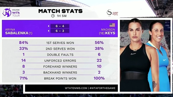 Соболенко здобула перемогу у двох сетах за 1 годину 5 хвилин.