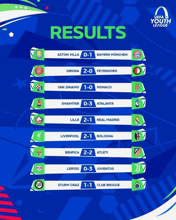 - 02.10. 15:00. Астон Вілла U19 – Баварія U19 – 0:1