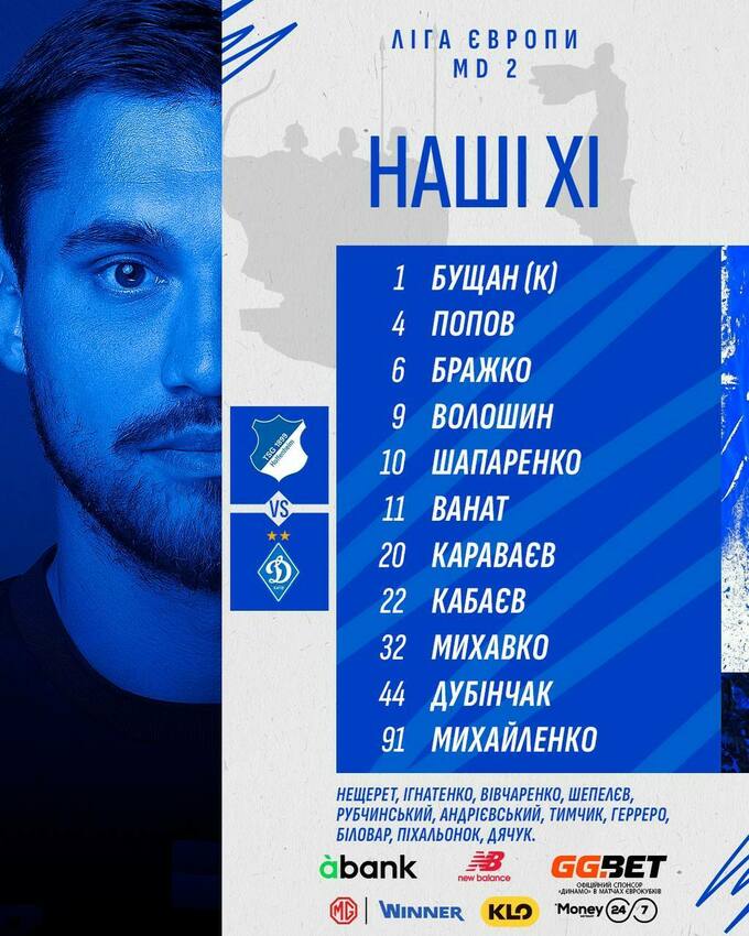 Став відомий стартовий склад Динамо на матч проти Хоффенхайма