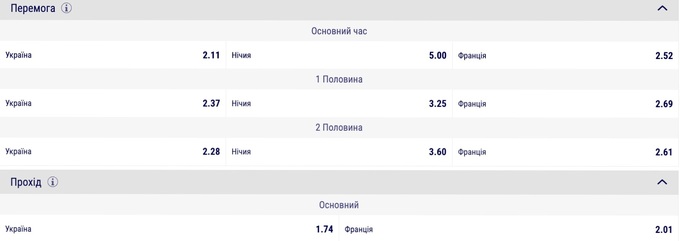 Букмекери вже виставили коефіцієнти на матч Україна – Франція. Фаворитами матчу є синьо-жовті. Коефіцієнт на перемогу в основний час України – 2.11, на Францію – 2.52, а на нічию – 5.00.