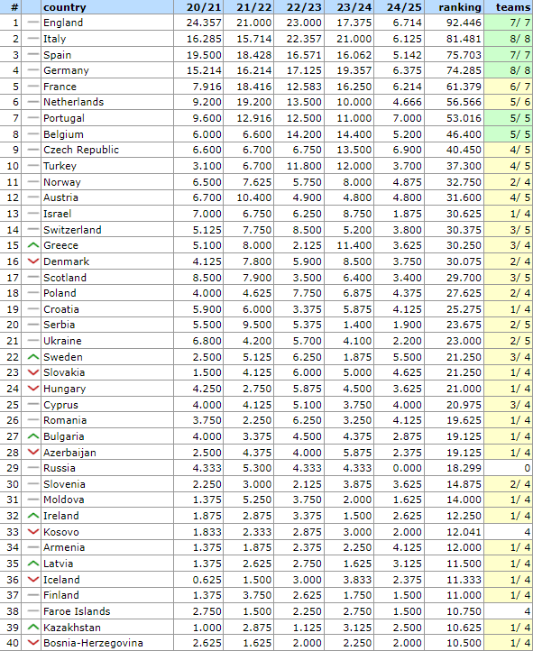 Таблиця коефіцієнтів УЄФА 2025 (впливає на розподіл путівок у сезоні 2026/27)
