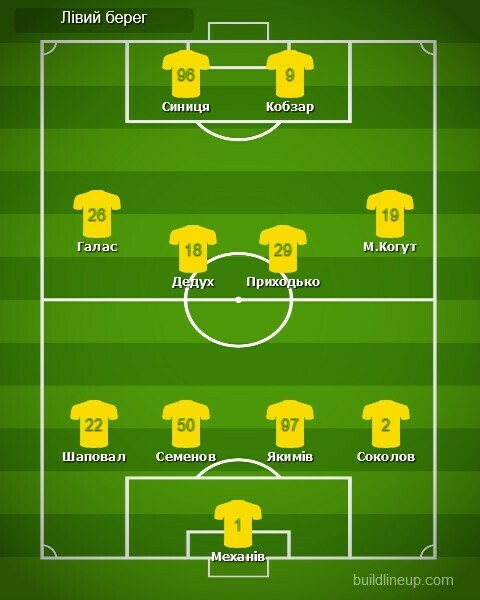«Лівий берег»: Механів, Шаповал, Семенов, Якимів, Соколов, Дедух, Приходько (Банада, 85), М.Когут (Войцеховський, 75), Синиця (Співаков, 75), Галас (І.Когут, 75), Кобзар (Сухоручко, 46)