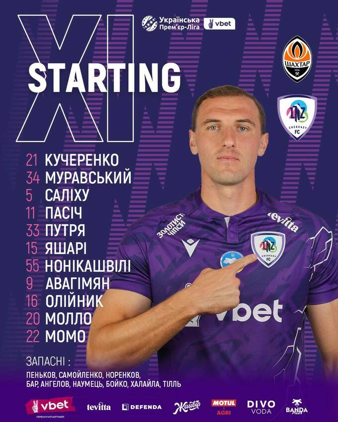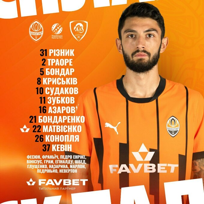 «Шахтар»: Різник – Азарові, Матвієнко, Бондар, Конопля – Судаков, Криськів (Назарина, 80), Бондаренко (Марлон, 68) – Кевін (Невертон, 46), Траоре (Егіналду, 68), Зубков (Педріньйо да Сілва, 73).