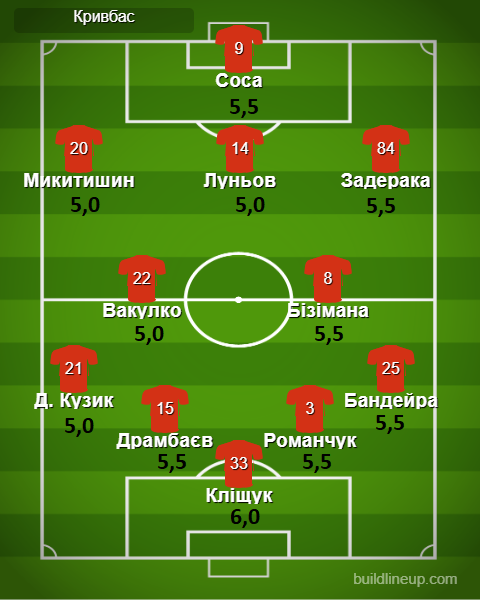 «Кривбас»: Кліщук – Бандейра, Романчук, Драмбаєв, Кузик – Вакулко, Бізімана (Іліч, 68) – Задерака, Луньов (Аморозо, 31), Микитишин (По, 46, Каменський, 78)) – Соса