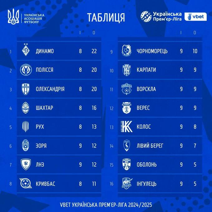 Турнірна таблиця УПЛ. Динамо утримує лідерство, Шахтар – на 4-му місці