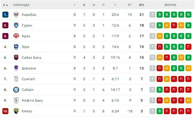 Чемпіонат Азербайджану. Турнірна таблиця