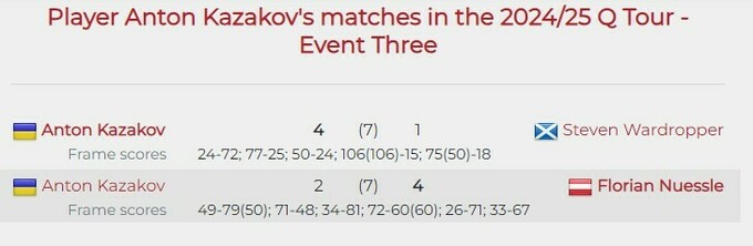 Український снукерист Антон Казаков зупинився у другому раунді аматорського турніру Q Tour 3.
