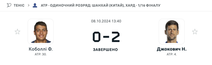 На турнірі АТР в Шанхаї сербський тенісист Новак Джокович здобув впевнену перемогу над італійцем Флавіо Коболлі. Матч тривав 1 годину та 4 хвилини. Джокович розгромив свого суперника з рахунком 6:1 та 6:2.