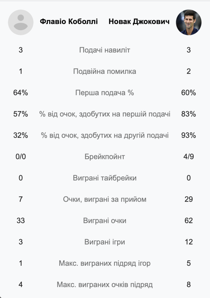 Обидва спортсмени зробили по три подачі навиліт, а от подвійних помилок у Джоковича на одну більше (1:2).