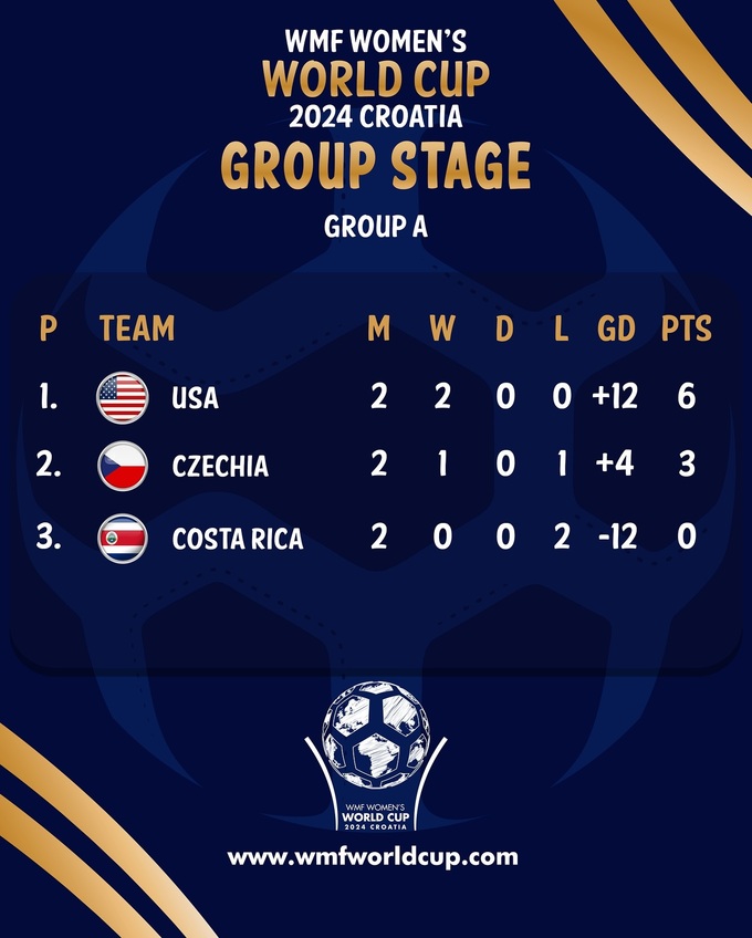 Змагання WMF Women's World Cup 2024 відбуваються з 7 до 10 жовтня. 7 команд були поділені на 2 групи. Збірна України виступала у групі B із командами Румунії, Мексики та Словаччини. У групі A зустрічалися США, Коста-Ріка та Чехія.