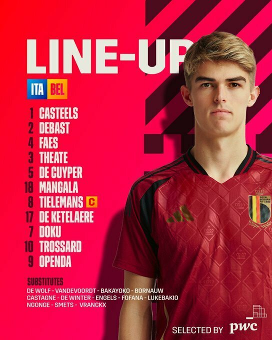Бельгія: Кастельс – де Кейпер, Теат (Вранкс, 69), Фас, Дебаст – Мангаля (Кастань, 68), Тілеманс – Доку (Фофана, 87), Троссар, Де Кетеларе (Лукебакіо, 68) – Опенда (Нгонге, 87).