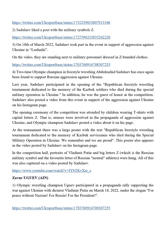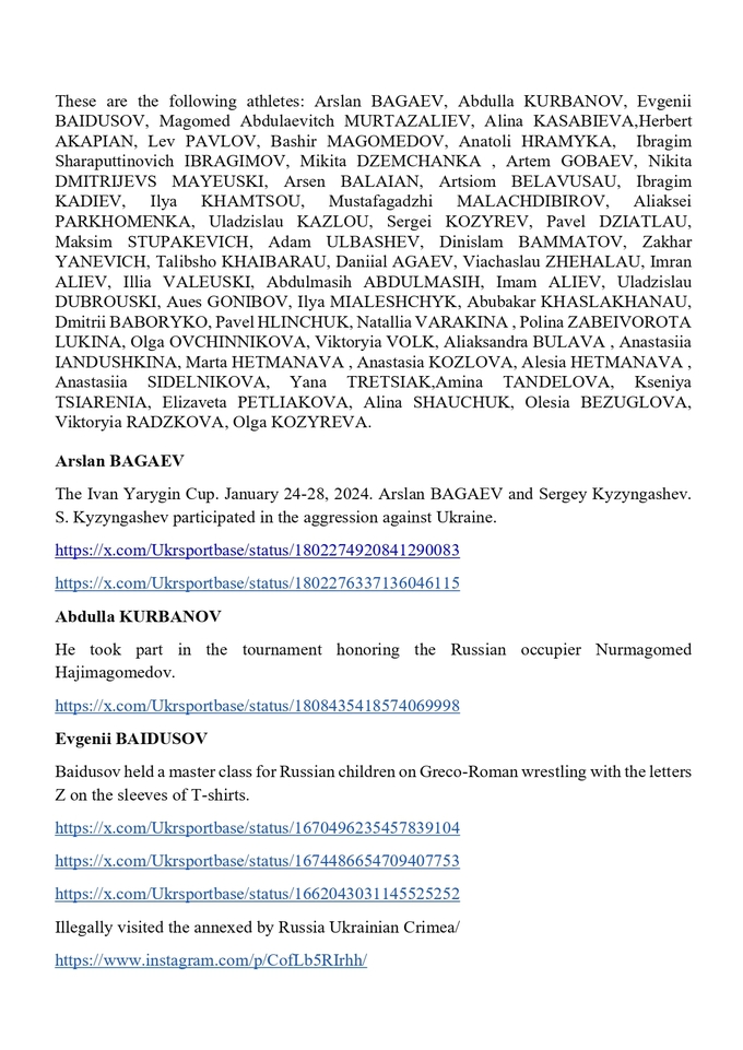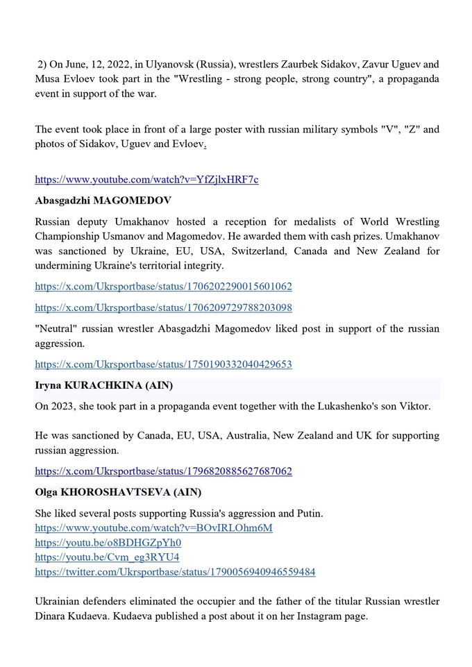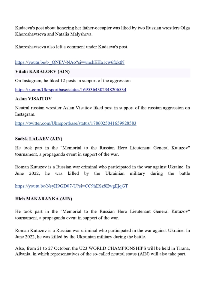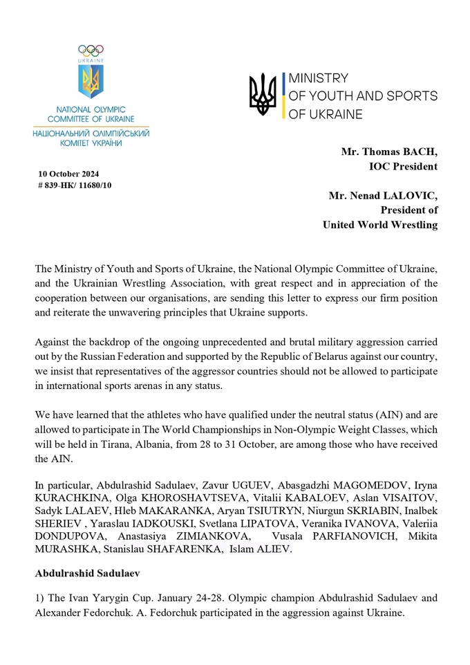 До участі в чемпіонаті світу з боротьби в неолімпійських вагових категорій, який пройде у столиці Албанії Тирані з 21 по 27 жовтня, допущено низку спортсменів, які отримали кваліфікацію під нейтральним статусом (AIN). Українські посадовці просять звернути увагу, що вказані спортсмени раніше брали участь у заходах на підтримку війни або висловлювали свою підтримку російській агресії та не відповідають достатнім критеріям, для отримання статусу індивідуального нейтрального атлета (AIN).