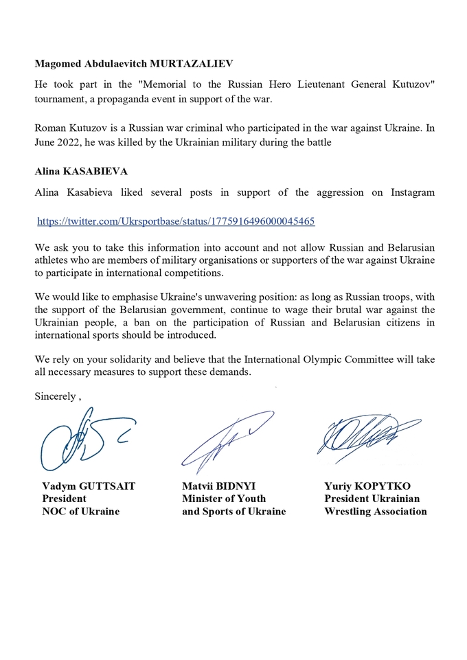 Президент Національного олімпійського комітету Вадим Гутцайт, Міністр молоді та спорту України Матвій Бідний та президент Федерації боротьби Юрій Копитко надіслали спільного листа президенту Міжнародного олімпійського комітету Томасу Баху та президенту Об'єднаного світу боротьби Ненаду Лаловичу. У листі вони закликають не допускати спортсменів з росії та білорусі до міжнародних змагань через підтримку агресії проти України.