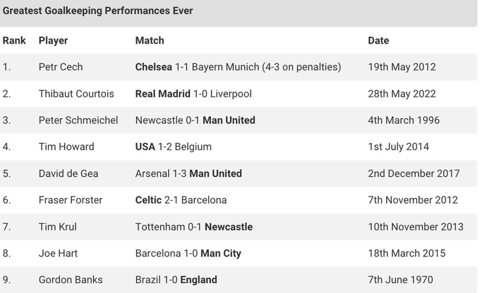 Першу позицію у рейтингу займає легендарний чеський воротар Петр Чех, який допоміг «Челсі» виграти фінал Ліги чемпіонів проти «Баварії» у 2012 році, перемігши у серії пенальті та відбивши одинадцятиметровий й у самій грі.