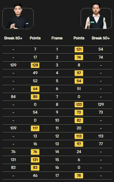 У Сі була перша можливість у 17-му фреймі, але він промазав складну червону кулю у зелену лузу, зупинивши серію на 46 очках. Сяо повернувся в боротьбу в партії й поставив складний снукер на останній червоній кулі, при цьому білий наблизився до зеленого біля борту. Після трьох спроб Сі залишив кулю на грі для Сяо, який скористалася шансом і завершив матч (10:7).