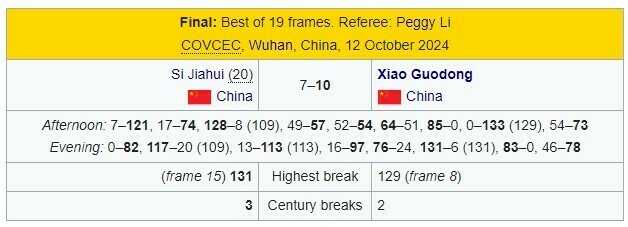 Китайський снукерист Сяо Годун нарешті завоював свій перший рейтинговий титул через 17 років після того, як став професіоналом. У фіналі турніру 2024 Wuhan Оpen він витримав натиск молодого китайця Сі Цзяхуея і здобув перемогу з рахунком 10:7.