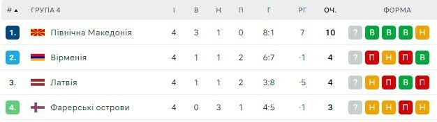 Турнірне становище: Північна Македонія (10 очок), Вірменія (4), Латвія (4), Фарерські острови (3).