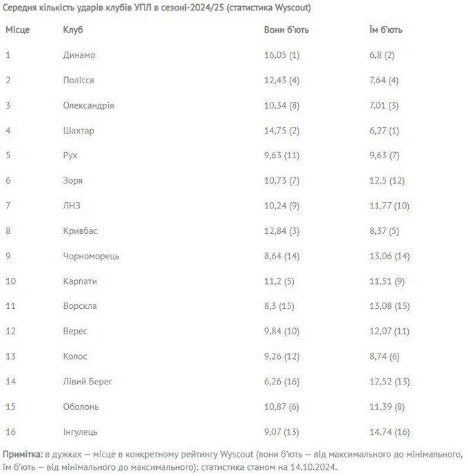 Лідерство «Динамо» в турнірній таблиці УПЛ підтверджується також лідерством в рейтингу Wyscout за середньою кількістю ударів по воротах суперника. Команда Олександра Шовковського – беззаперечний №1 в ньому – 16,05 ударів в середньому за 90 хвилин.