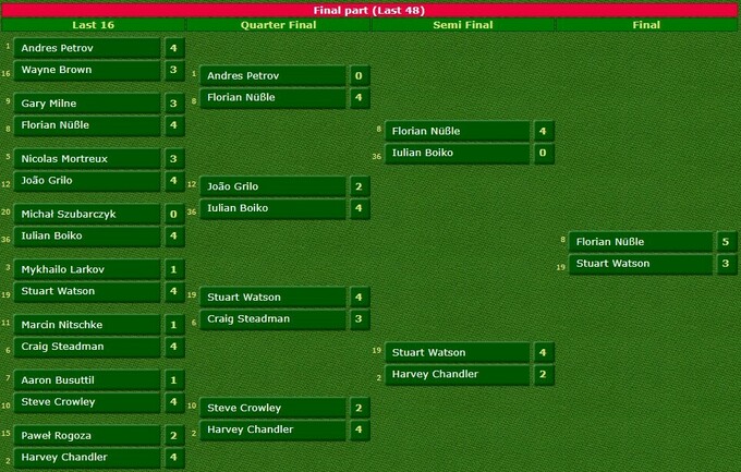 У фіналі 18 жовтня о 18:00 грають Флоріан Нюссле із Австрії та Стюарт Уотсон із Англії.