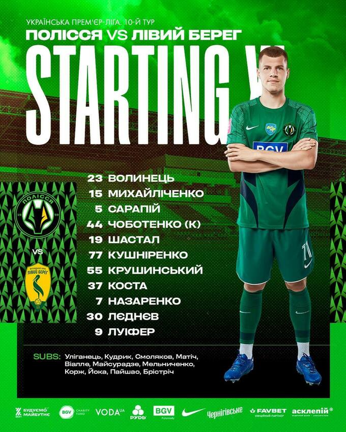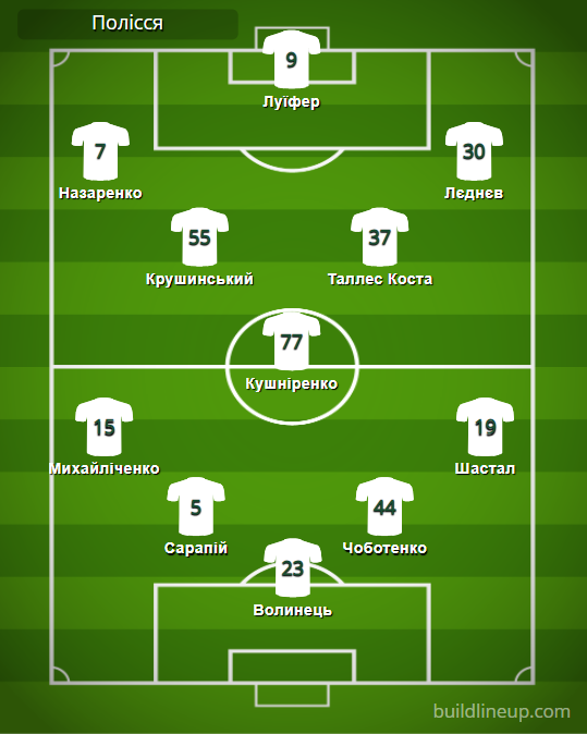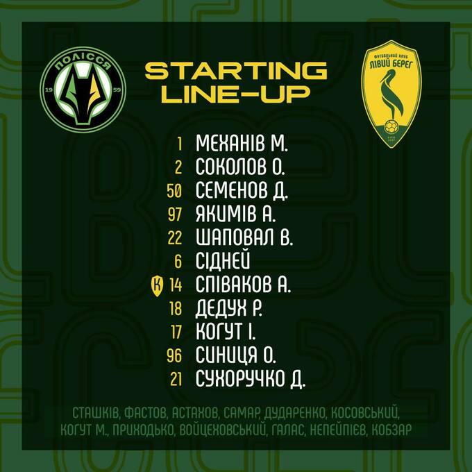 «Полісся»: Волинець – Михайліченко, Сарапій (Брістрич, 81), Чоботенко, Шастал (Віалле, 57) – Крушинський (Смоляков, 81), Кушніренко, Таллес Коста – Назаренко, Луїфер (Пайшао, 57), Лєднєв.