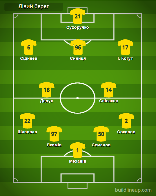 «Лівий берег»: Механів – Шаповал, Якимів, Семенов, Соколов – Дедух, Співаков (Приходько, 80) – Сіднней, Синиця (Войцеховський, 80), І. Когут (М. Когут, 66) – Сухоручко.