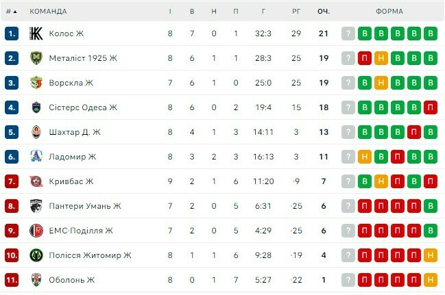 У турнірі лідирує Колос (21 очко), який у гостях здолав харківський Металіст 1925 (2:1).