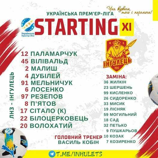 «Інгулець»: Паламарчук – Мельничук, Малиш, Вілівальд, Дубілей – П’ятов (Козиренко, 79), Волохатий, Лосенко (Кисленко, 69) – Білоцерковець (Могильний, 88), Сітало (Сад, 69), Резепов (Пушкарьов, 69).