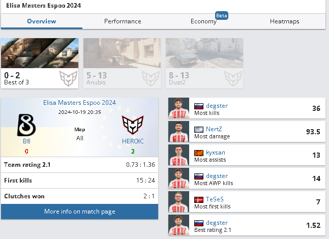 Український кіберспортивний клуб B8 завершив свою участь у турнірі Elisa Masters Espoo 2024 на стадії півфіналу, поступившись одному з найсильніших колективів світу — Heroic. Матч відбувся 19 жовтня 2024 року, і закінчився поразкою B8 з рахунком 0:2 за картами (Anubis 5:13, Dust2 8:13). Це був перший LAN-турнір для українського колективу на такому рівні, і, незважаючи на виліт, команда отримала важливий досвід перед наступними важливими змаганнями.