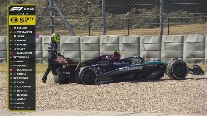 Провальний етап вийшов для Мерседеса. Після невдачі в кваліфікації Льюїса Хемілтона і Джорджа Расселла гонка погано почалася для 7-разового чемпіона, який на третьому колі припустився помилки і вилетів у гравій, викликавши машину безпеки.