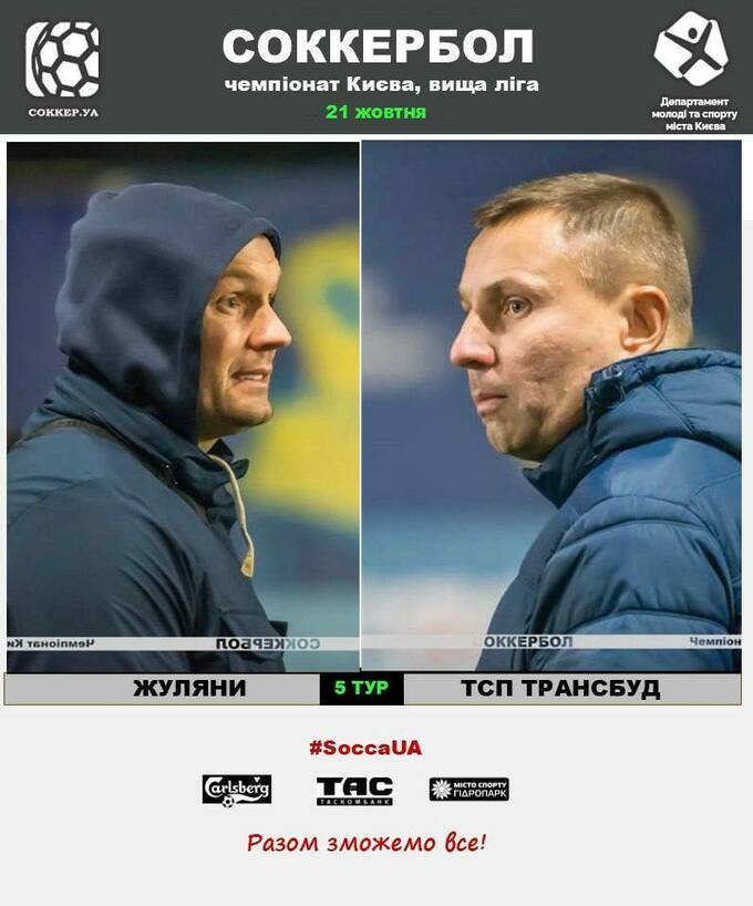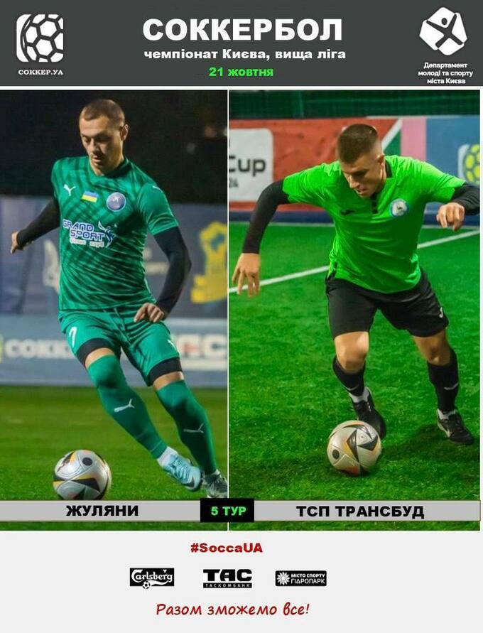 В пʼятому турі вищої ліги чемпіонату з соккеру зустрічаються ЖУЛЯНИ з ТСП ТРАНСБУД .