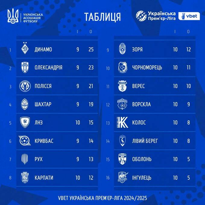 Турнірна таблиця УПЛ. Динамо лідирує та випереджає Шахтар на 6 очок