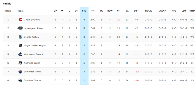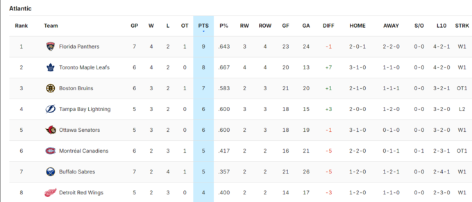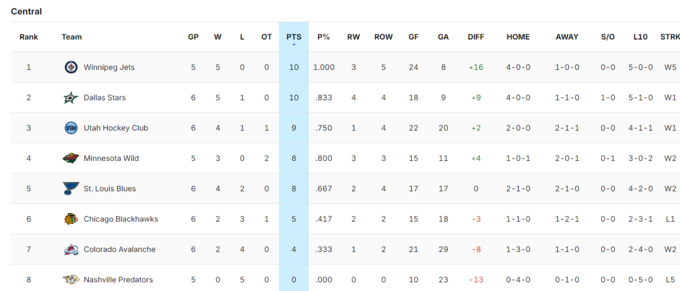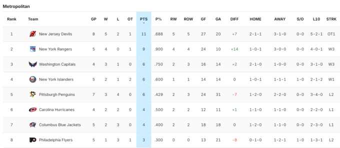 Після двох тижнів регулярки на Сході лідирують Нью-Джерсі, Нью-Йорк Рейнджерс та Флорида: у Дияволів 11 пунктів, а Рейнджери та Пантери набрали по 9. На Заході з 10 очками лідирують Вінніпег та Калгарі. Джетс ще не програвали у сезоні.