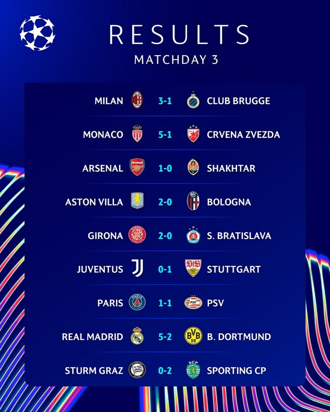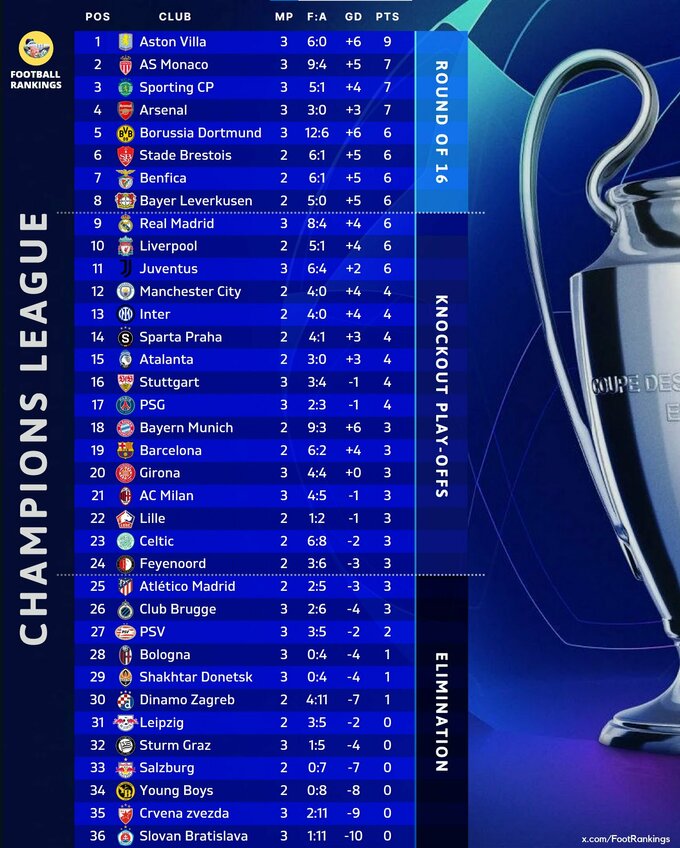 Одноосібним лідером стала Астон Вілла (9 очок з 9), далі йдуть Монако, Спортінг, Арсенал (7).