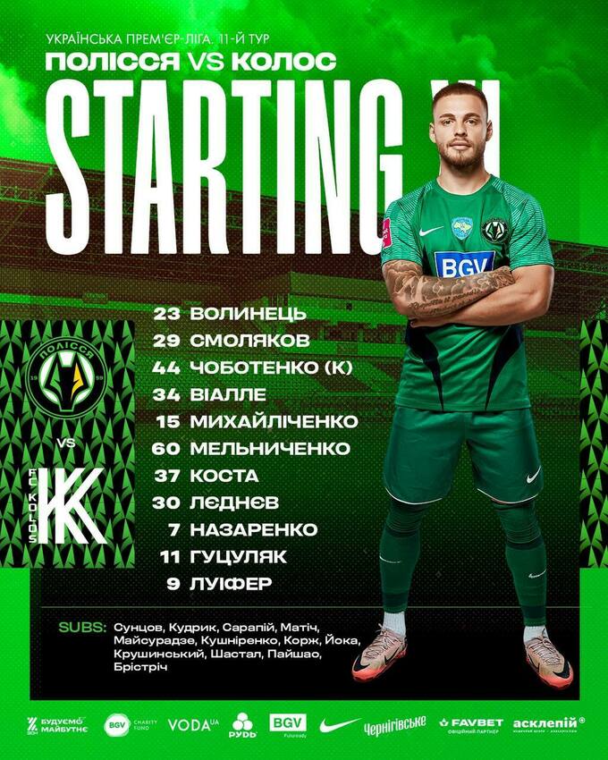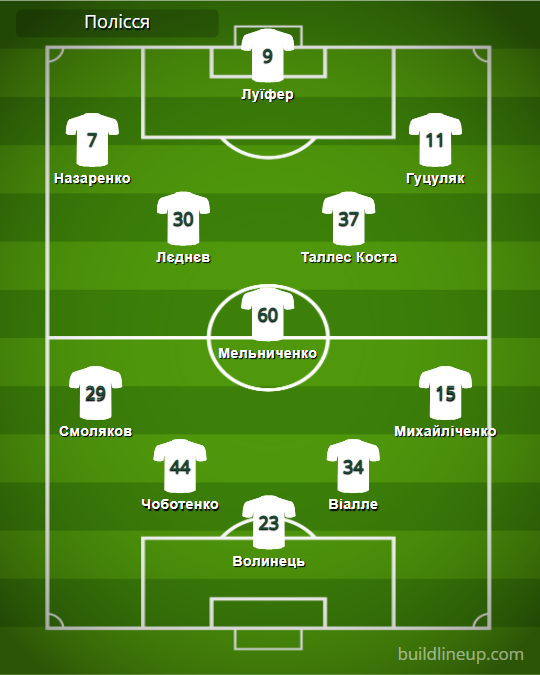 «Полісся»: Волинець – Смоляков, Чоботенко, Віалле (Сарапій, 46), Михайліченко – Лєднєв (Йока, 88), Мельниченко (Кушніренко, 79), Таллес Коста (Крушинський, 66) – Назаренко, Луїфер (Пайшао, 46), Гуцуляк.