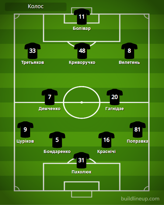 «Колос»: Пахолюк – Цуріков, Бондаренко, Краснічі, Поправка – Демченко, Гагнідзе – Третьяков (Оріховський, 63), Криворучко (Алефіренко, 63), Велетень (Гусол, 83) – Болівар (Паулаускас, 63).
