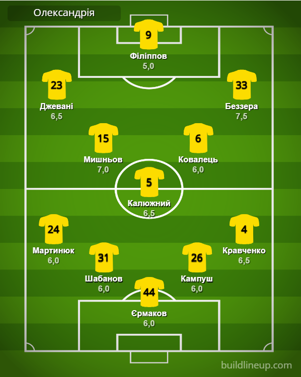 «Олександрія»: Єрмаков – Мартинюк, Шабанов, Кампуш, Кравченко (Копина, 89) – Мишньов (Смирний, 69), Калюжний, Ковалець (Козак, 46) – Джевані, Філіппов (Кулаков, 76), Безерра (Бєляєв, 89).