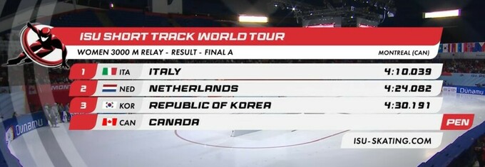 Італійки К'яра Бетті, Еліза Конфортола, Глорія Йор'ятті та Аріанна Сігель перемогли у жіночій естафеті на першому етапі Світового туру шорт-треку 2024/25 у канадському Монреалі.