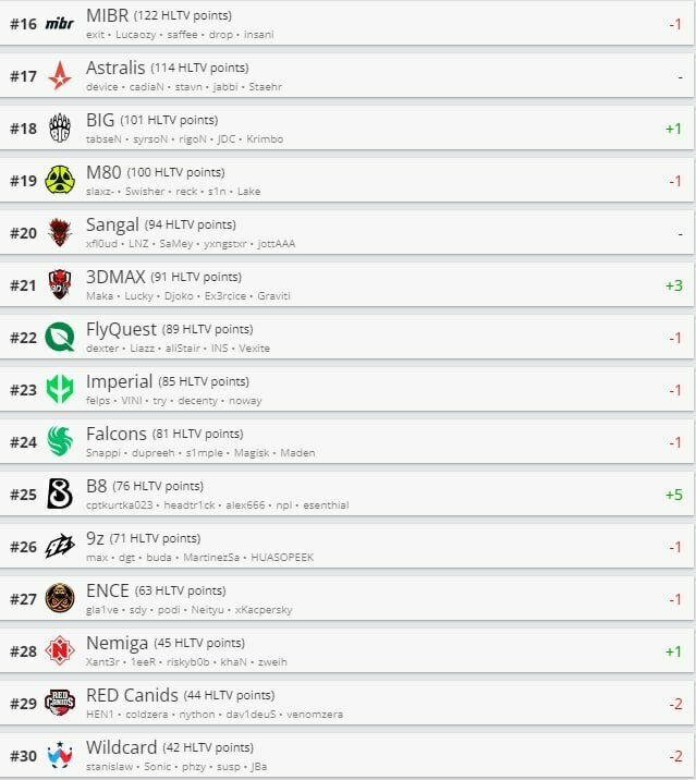 Ще одна українська команда, B8 Esports, піднялася одразу на 5 сходинок і тепер займає 25 місце. Під керівництвом Андрія «npl» Кухарського, команда поступово нарощує результативність, демонструючи прогрес і впевненість у своїх силах. Це великий успіх для B8, що свідчить про зростаючу конкурентоспроможність українського кіберспорту на світовій арені.