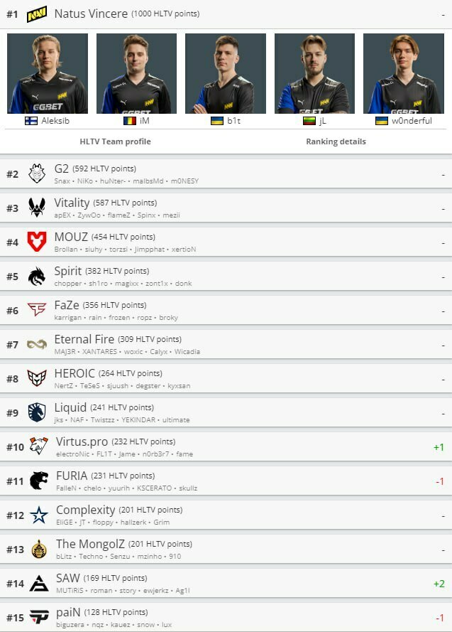 Команда Natus Vincere вже понад місяць утримує перше місце в рейтингу HLTV, впевнено лідируючи з результатом у 1000 балів. На чолі з досвідченим капітаном Алексі «Aleksib» Віролайненом та українськими гравцями Ігорем «w0nderful» Ждановим та Валерієм «b1t» Ваховським, NaVi зберігає стабільність на світовій арені, підтверджуючи статус однієї з найсильніших команд світу.