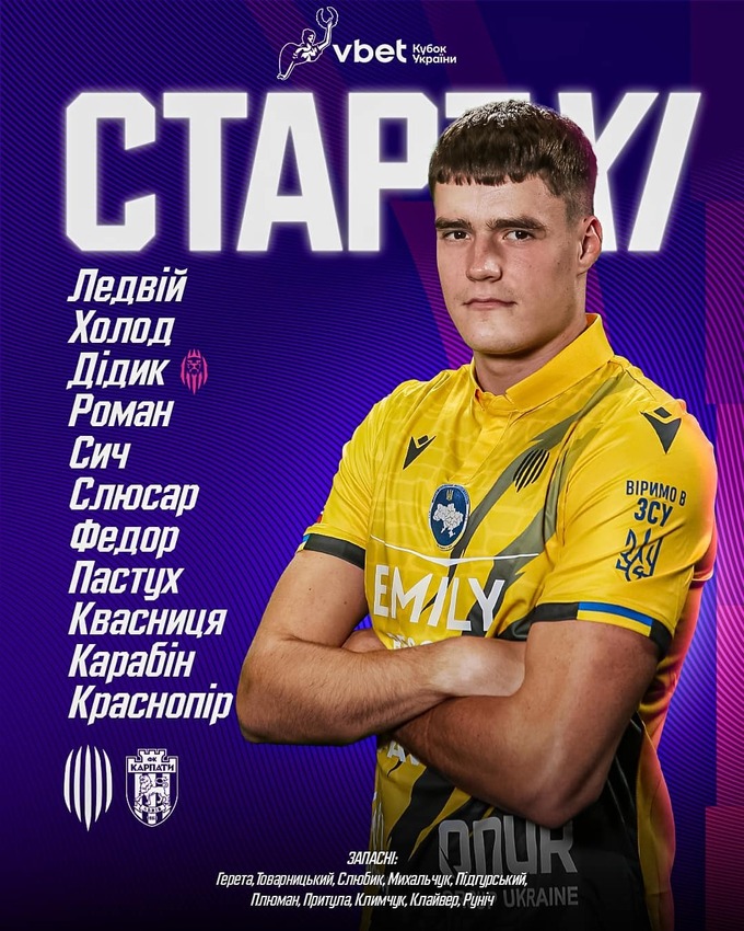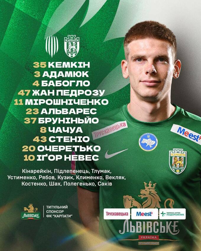 «Карпати»: Кемкін – Адамюк, Педросо, Бабогло, Мірошніченко – Бруніньйо (Векляк, 90+3), Альварес, Чачуа (Клименко, 87) – Очеретько (Шах, 82), Ігор (Устименко, 83), Стеніо (Костенко, 83).