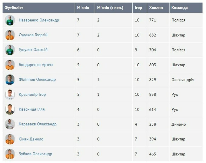 Лідером залишається футболіст Полісся Олександр Назаренко, який забив 7 голів і зробив 5 асистів (12 балів).