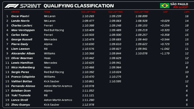 У рамках гран-прі Формули-1 у Бразилії відбулася спринтерська кваліфікація. Поул завоював пілот Макларена Оскар Піастрі, який випередив напарника Ландо Норріса.