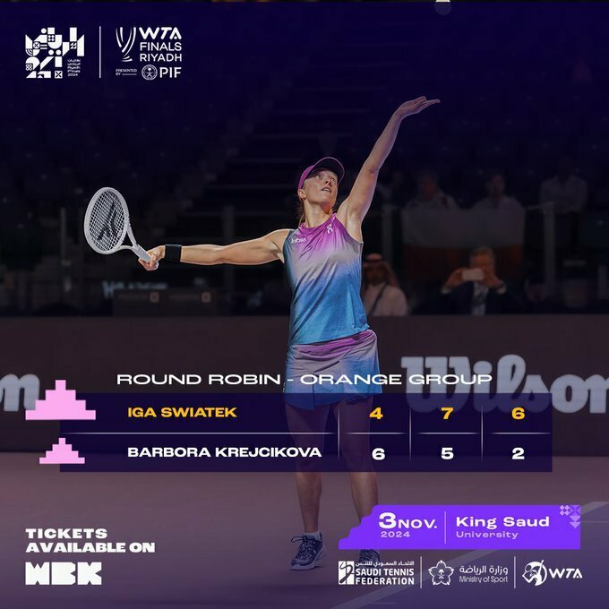 Це десята перемога Свьонтек у 13 зіграних матчах на WTA Finals. Минулого року полька стала чемпіонкою змагань.