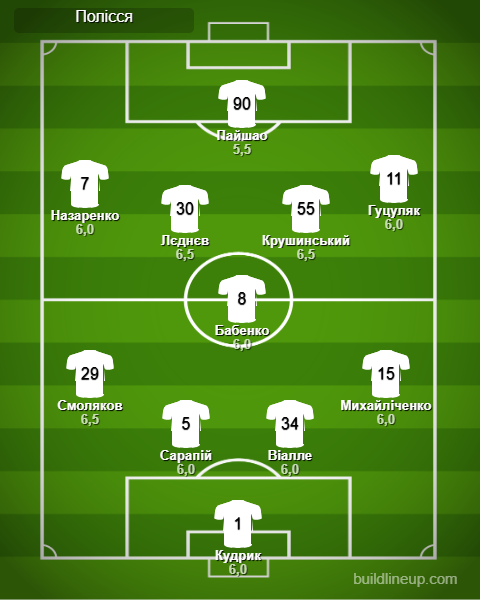 «Полісся»: Кудрик – Смоляков, Сарапій, Віалле, Михайліченко – Лєднєв (Мустафаєв, 68), Бабенко, Крушинський (Таллес Коста, 82) – Назаренко, Пайшао (Венделл, 55), Гуцуляк.