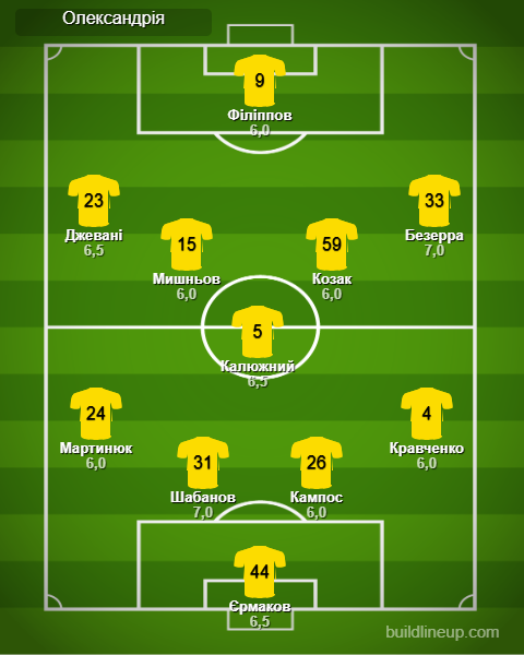 «Олександрія»: Єрмаков – Мартинюк, Шабанов, Кампуш, Кравченко – Мишньов (Смирний, 62), Калюжний, Козак (Ковалець, 63) – Джевані (Бєляєв, 63), Філіппов (Кулаков, 76), Безерра (Копина, 90+2).