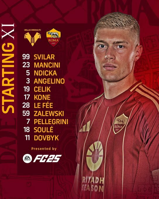 Тренери оголосили стартові склади. Український форвард римлян Артем Довбик потрапив до стартового складу на гру.