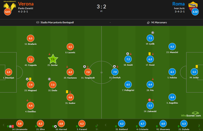 Найкращим гравцем поєдинку був визнаний хавбек Верони Суат Сердар (7.5).