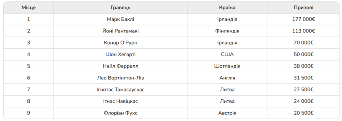 Підсумкова таблиця Main Event Irish Poker Festival з бай-іном €3,000: