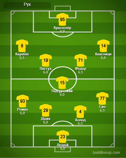 «Рух»: Ледвій – Роман, Дідик, Холод, Сич – Пастух, Підгурський, Федор (Притула, 65) – Карабін (Клайвер, 74), Краснопір (Климчук, 74), Квасниця (Руніч, 64).
