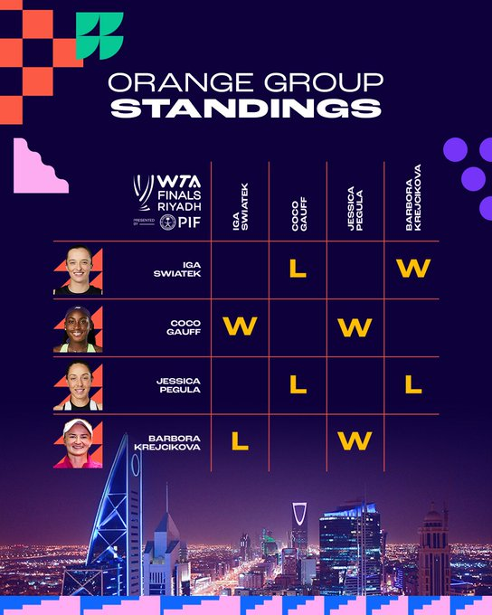 5 листопада відбулися матчі 2-го туру Помаранчевої групи на Підсумковому турнірі WTA 2024, який проводиться в Ер-Ріяді (Саудівська Аравія).